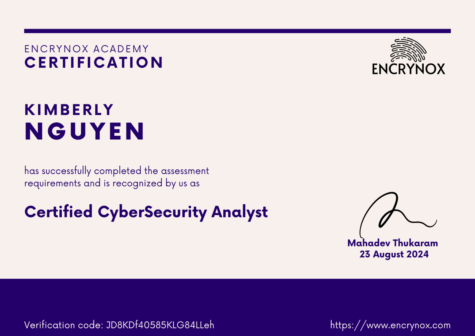 You will gain Encrynox Academy certification as Certified CyberSecurity Analyst on successful passing final certification assessment!